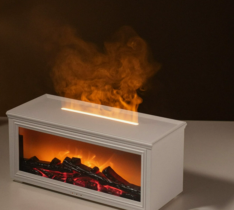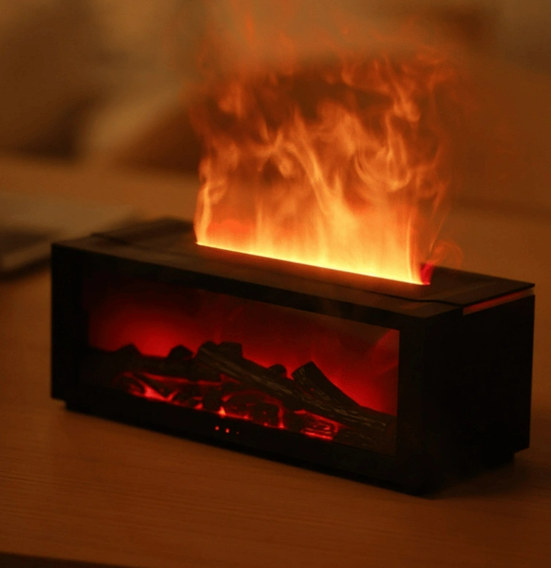 The Simulation Fireplace Flame Humidifier is a uniquely designed rectangular humidifier that mimics the cozy ambiance of a real fireplace. Its front features a lightbox that simulates burning logs, creating a warm and inviting atmosphere when turned on. As mist rises from the top, it is illuminated by LED lights, producing a mesmerizing flame effect.