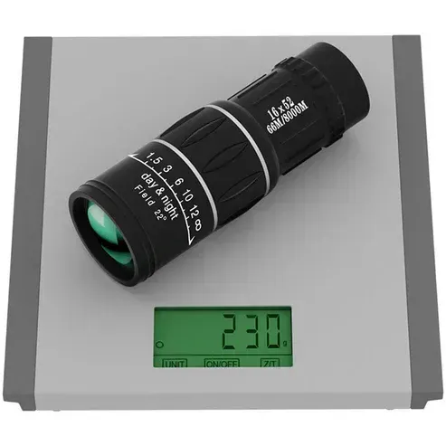 SPECIFICATIONSFork: 16xObjective lens: 52 mmPrism system: Roof prismZoom system: BifocalWaterproof: YesReach: 66m/ 8000mType of gienskyage: Rotates left and rightDistance: FMC (army grade) coatingProduct size: 150x55mmProduct weight: 252 gPackage includes: 1* 16X52 monocular, 1* bag, 1* handle, 1* cloth