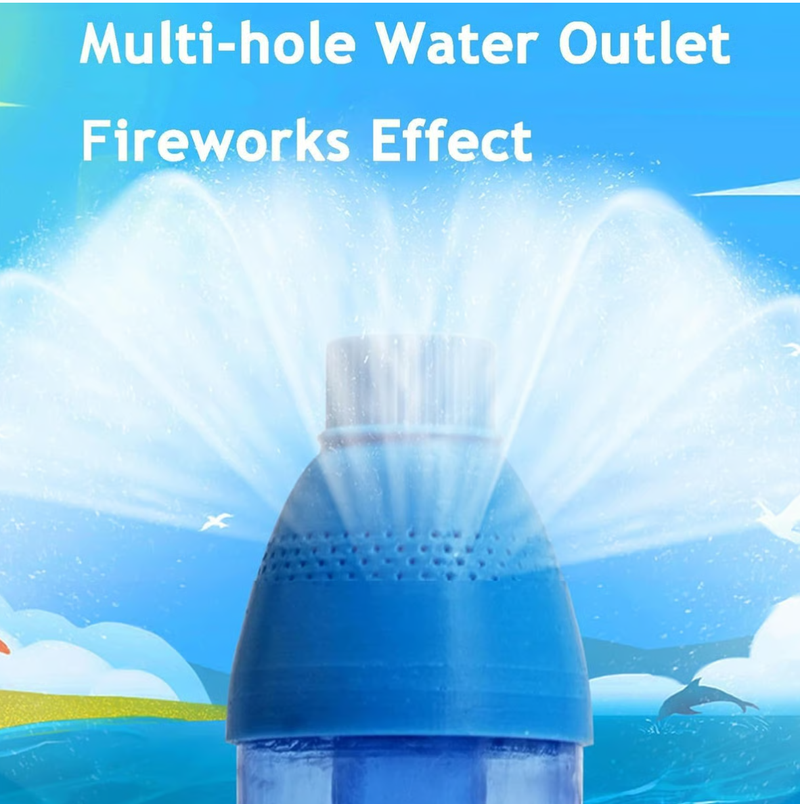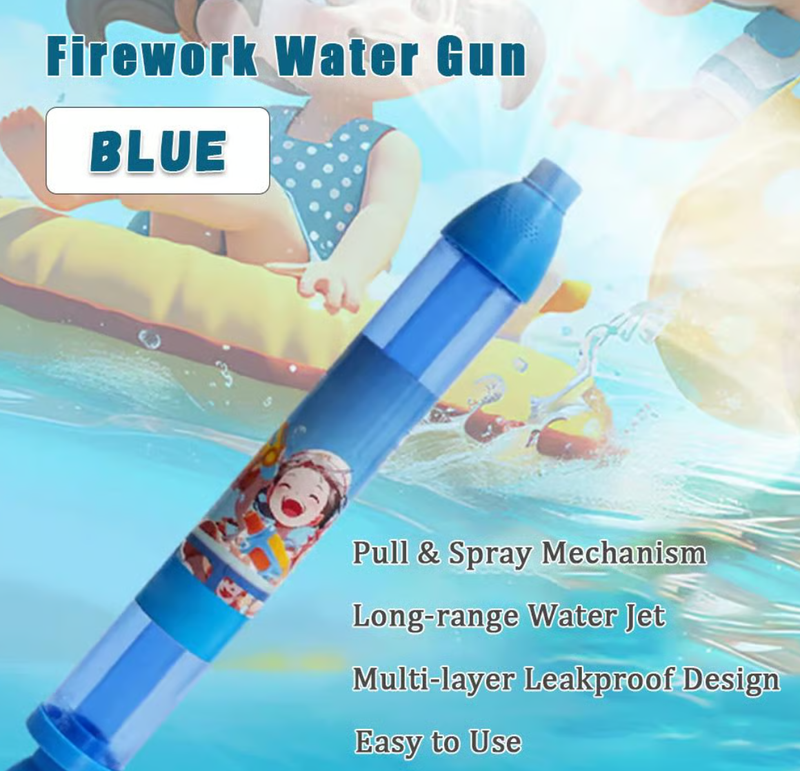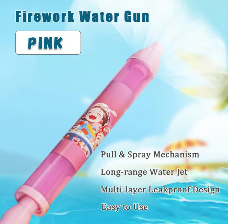 This firework water squirter gun adopts a pull-out design. Just immerse the nozzle in the water, pull out the water pump to fill the water, aim the toy gun upwards, and then push the water pump to spray out pleasing fireworks water splashes