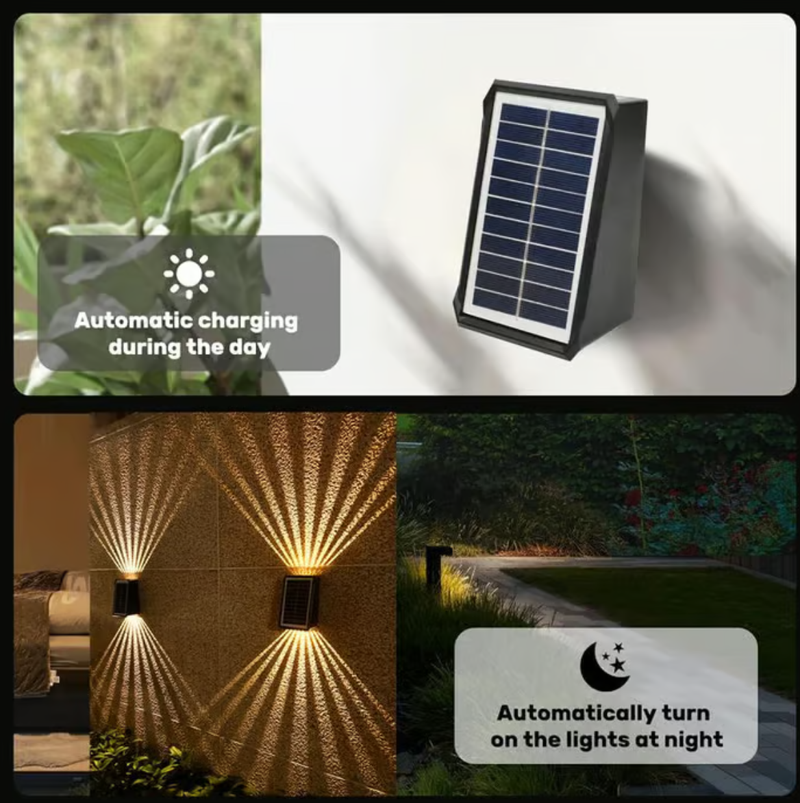 Dusk to Dawn Solar Wall Lights: These waterproof solar wall lights are designed with intelligent light control; they automatically charge during the day via direct sunlight and turn on at night.