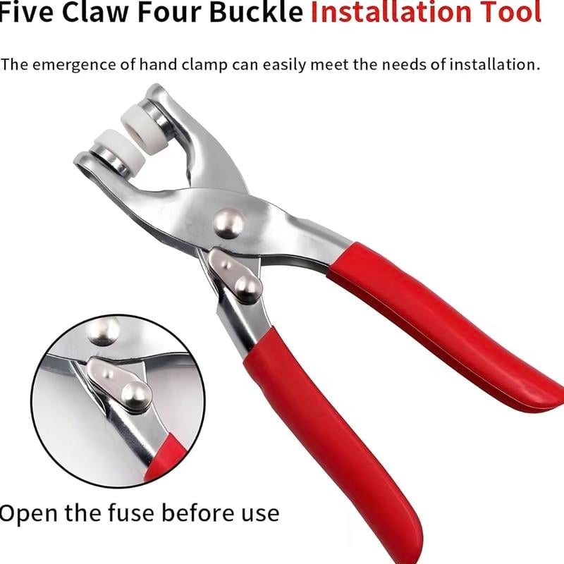 The Five-Claw, Four-Buckle Installation Tool is engineered for simplicity. The hand clamp allows you to apply even pressure, enabling you to attach snaps perfectly and easily in just one press.