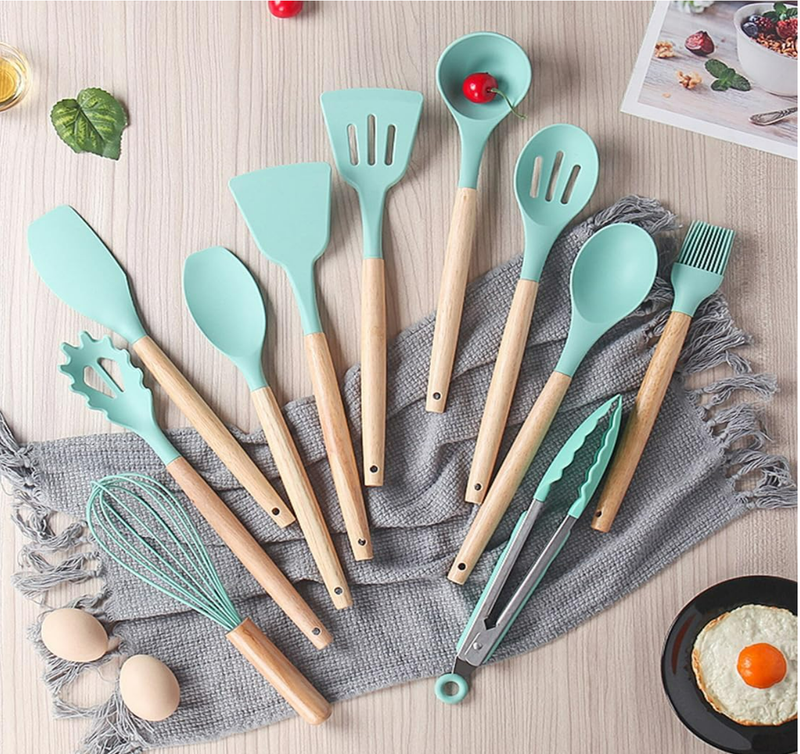 • 11pcs Cooking utensils are made of highly durable silicone. Including Deep Soup Ladle. Serving Spoon. Slotted Spoon. Slotted Turner. Pasta Server. Flexible Spatula. Basting Brush. Whisk. Tongs. Round Spatula. Turner.