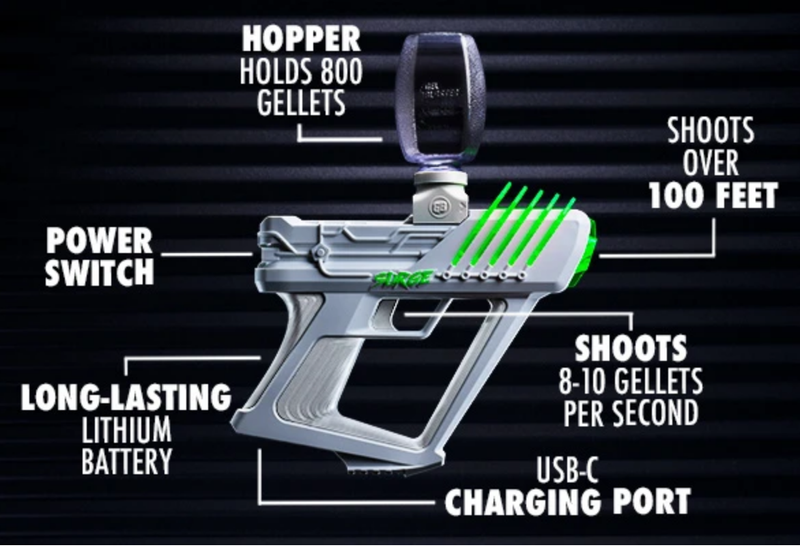 **OVERSTOCK SALE** Move over paintball, airsoft, and foam darts… there's a new crack shot battle set in town. Gel Blaster Surge combines the thrill of combat simulation games with the ease and fun of water warfare.The ammo you'll be using are Gellets, tiny water marbles that you pre-soak to give them just the right amount of give to explode on impact (think tiny Spitballs). With a battery-powered automatic-fire blaster shooting at 150 feet-per-second, a hit will raise the stakes of battle with just enough of a slight sting to make you regret not getting the drop first. They're also biodegradable, mess-free, and stain-free, so you don't need to worry about chasing them down to collect every last one after you've called a truce.Target practice by yourself or battle competitively… either way, with Gel Blaster Surge, you're sure to have a blast!