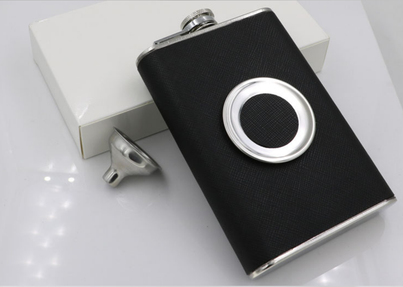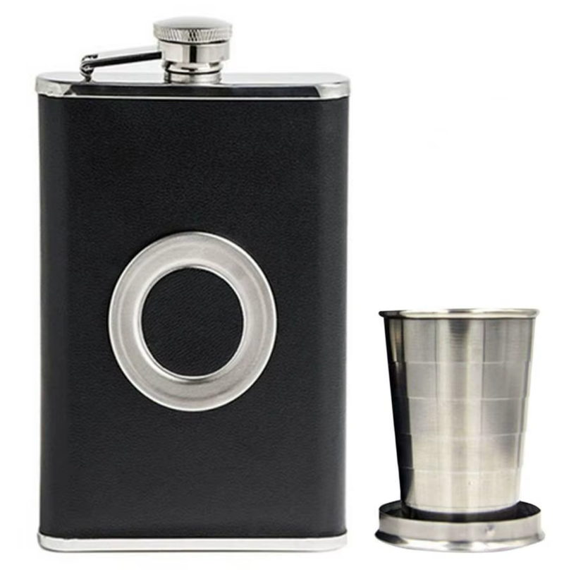 Featuring an eight ounce capacity, the flask (also made from stainless steel) is wrapped in bonded leather.